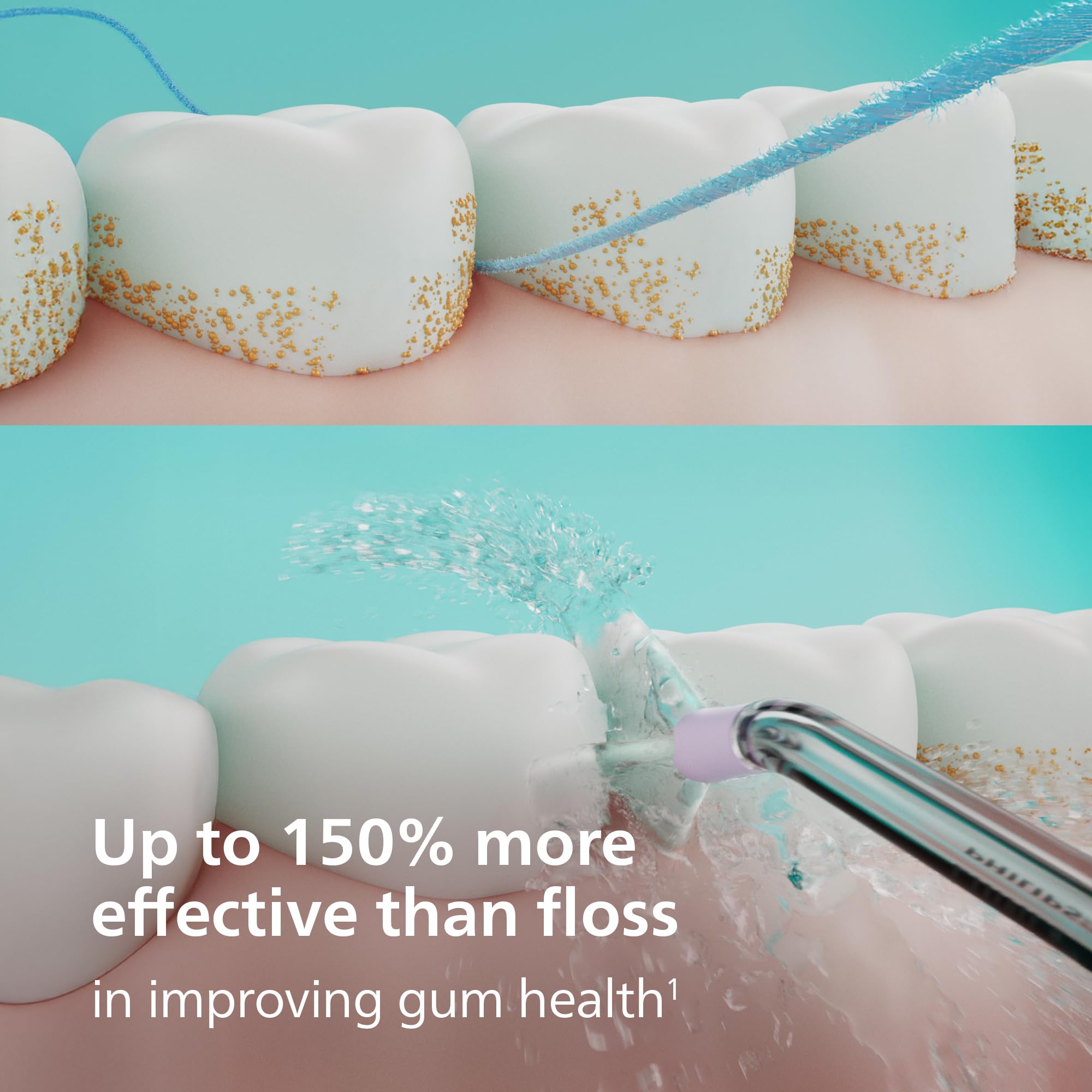 - Improve gum health in 2 weeks: Philips Sonicare cordless water flosser is up to 150% more effective than floss in improving gum health¹ ; it also removes up to 99% of plaque from below the gumline²